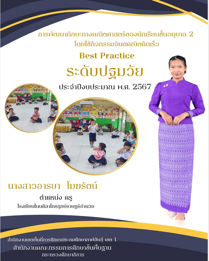 ชื่อผลงาน : รางวัล Best practice ระดับ ดีเลิศ โครงการ IFTE ปีงบประมาณ 2568 การพัฒนาทักษะทางคริตศาสตร์ของนักเรียนชั้นอนุบาล 2 โดยใช้กิจกรรมจินตคณิตคิดเร็ว ประจำปี 2568